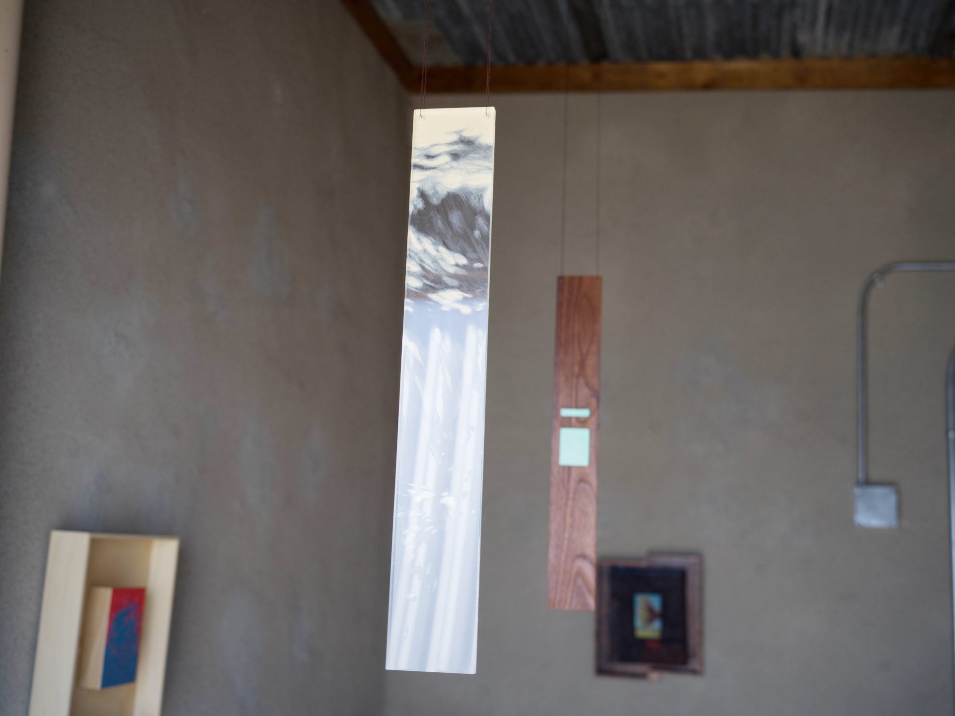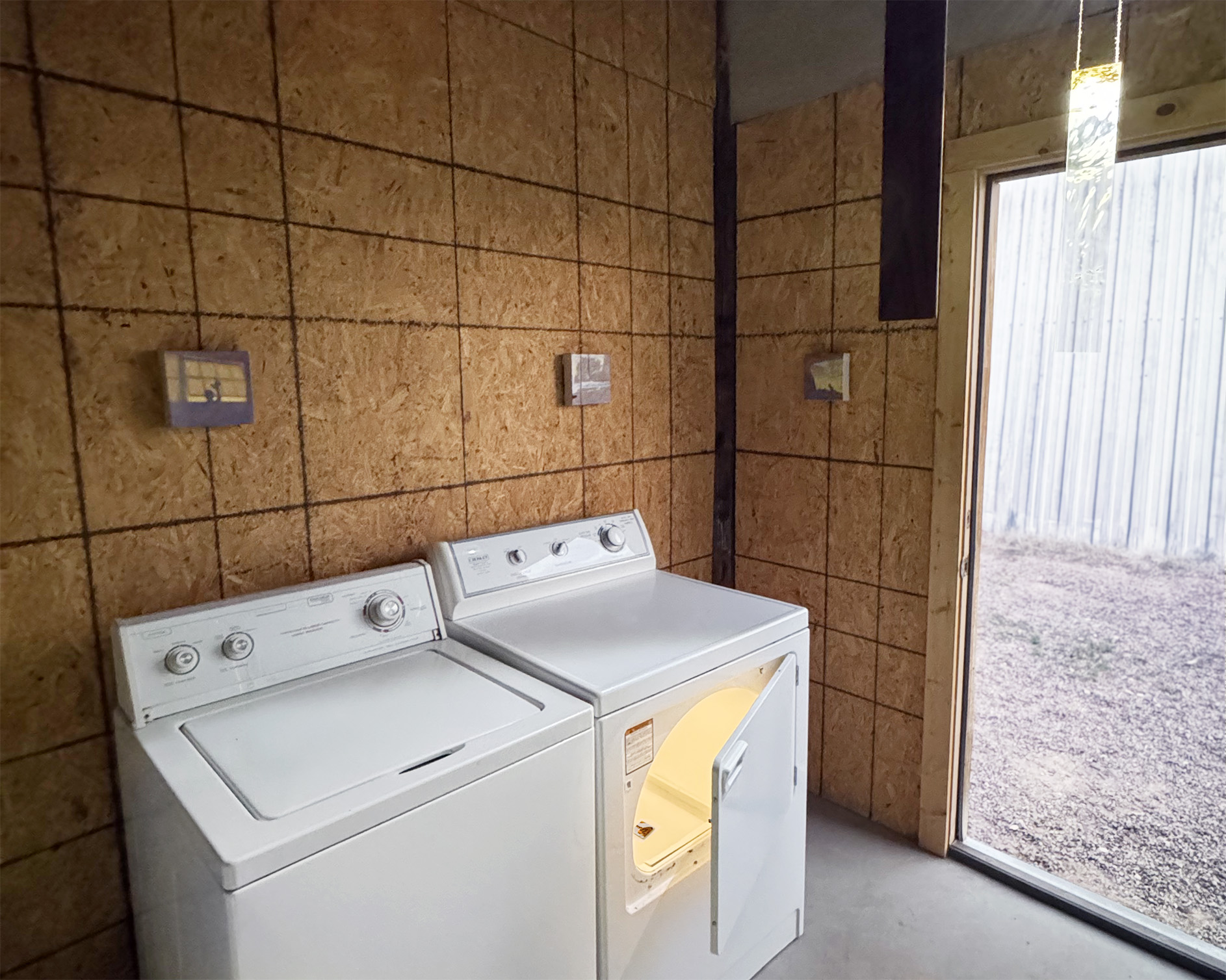 The gallery space is a small laundry room in Marfa which makes for an unexpected and intimate setting. A hanging piece of painted plexiglass gives the characteristics of a reflective window. Behind it, a similar sized piece of walnut frames it, suggesting an interior. This seemingly floating combination turns the small laundry room into a home without walls. A tiny square painting lays flat in the dryer, begging the viewer to lean in close to get a glimpse into the painted figure’s distorted world.